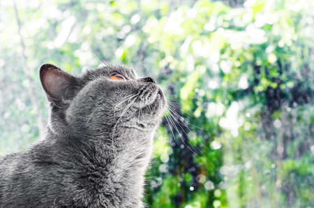 Gray cat Scottish breed looks out the window, green background, drops rain on the glass