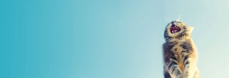 Cute gray cat shouts with open mouth on the blue sky background. Happiness, unbridled joy, euphoria. cry from the heart, wait for the cherished moment. concept of success, victory. copy space, banner