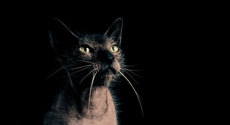Portrait of Lykoi cat looking curious away. Panoramic image with black background.