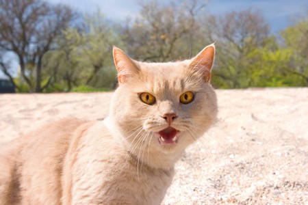 A hungry cat show his red tongue while roaring
