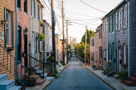 Colorful row houses along Chapel Street in Butchers Hill, Baltimore, Maryland