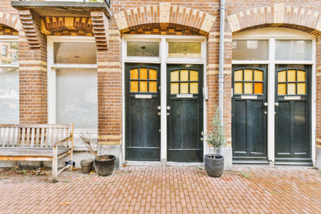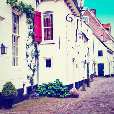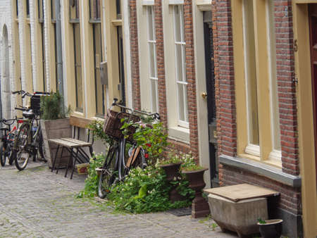 Traditional urban at Leiden, Netherlands. Red brickwall building with lantern, cobblestone path, parked bicycle, green plants at houses sides. Destination Holland.