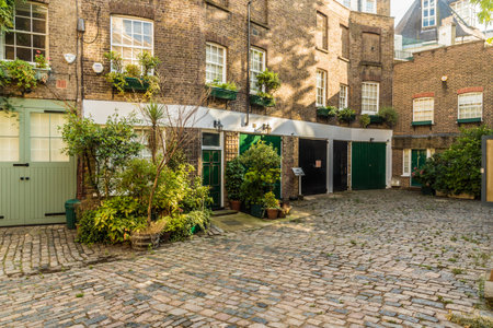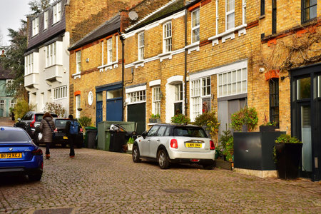 LONDON, UK - 10 NOV 2018: Views along Kynance Mews in the Royal Borough of Kensington and Chelsea in London. The outside of buildings can be seen.