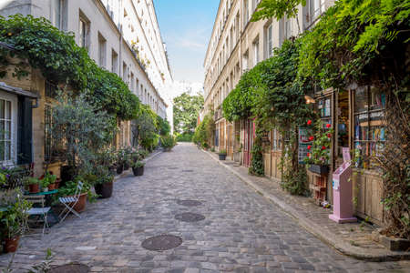 Paris, France - June 24, 2020: Passage Lhomme, one of the romantic courtyards in the East of Paris, France. These bucolic, unusual and hidden spots are delightful gems to explore