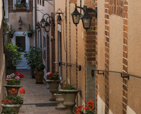 Small alley in Hautvillers with geranium and lanterns in the Champagne district in France.