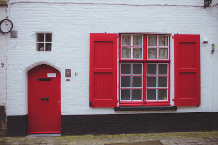 white and black facade of building from bricks with a red door and a large window with red shutters