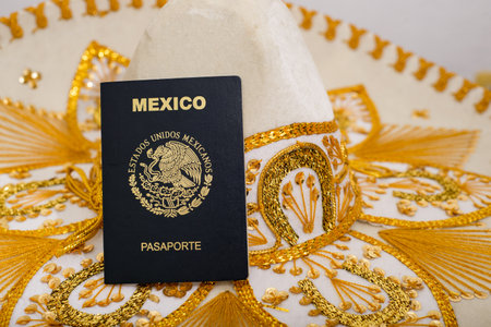 Mexican passport on charro hat. Mariachi hat and Mexican passport. Mexican citizenship concept.
