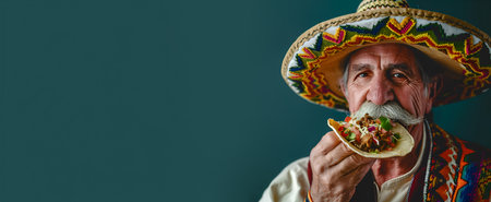 An older man with a distinguished mustache enjoys a taco while wearing a colorful sombrero. His vibrant attire and the rich texture of the taco highlight Mexican culture.