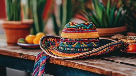 A vibrant traditional hat rests on a rustic wooden table, accompanied by fresh fruits and lush green plants, creating a lively and inviting atmosphere.
