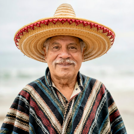 Portrait of a smiling mexican senior on hat and poncho over white background