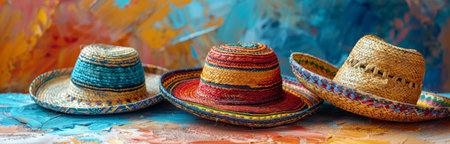 Straw hat on Mexican textile rug with vibrant colors. Concept of traditional attire, cultural heritage, summer fashion, festival decoration. Copy space. Banner.