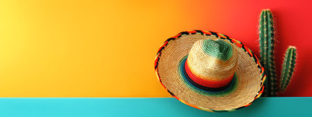 Vibrant sombrero against colorful background with cacti. Mexican culture and festive vibes. Concept of celebration, traditional attire, Hispanic heritage, bold design, cactus. Banner. Copy space.