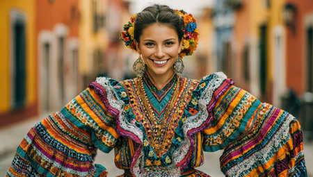 Joyful young woman wearing colorful traditional clothing and floral accessories stands in a lively street, celebrating cultural heritage and vibrant community atmosphere