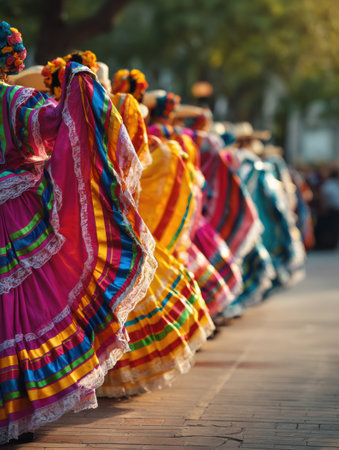 Hispanic Heritage Month celebration, colorful traditional dresses, twirling, vibrant cultural energy.