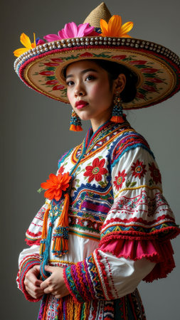 Young Asian female in colorful traditional attire with floral embellishments and wide-brimmed hat.