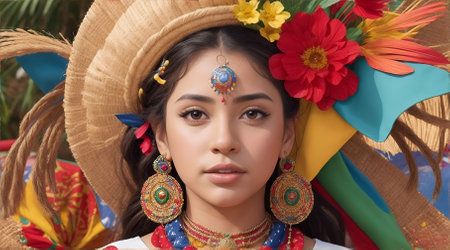 A woman in vibrant traditional clothing with a flower headdress smiles warmly. She is part of a festive scene. Concept of cultural celebration. Hispanic Heritage Month, celebrating culture.