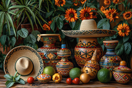 Still life with Mexican pottery, wide brim straw sombrero and bowl of citrus on a colorful geometric background under sunlight
