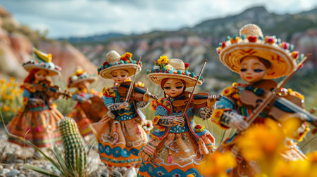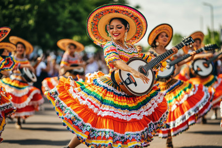 Festive street scene with smiling people in traditional Mexican clothing singing and dancing, AI generated