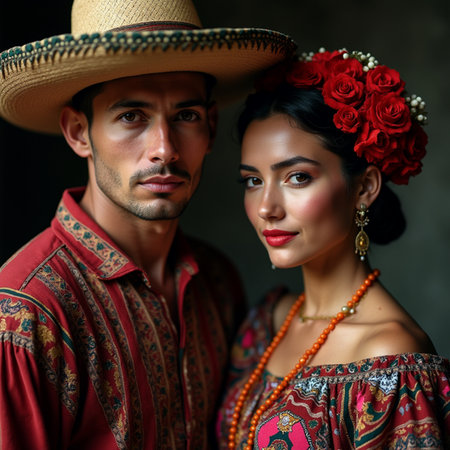 Portrait of a beautiful young couple in traditional Mexican clothing