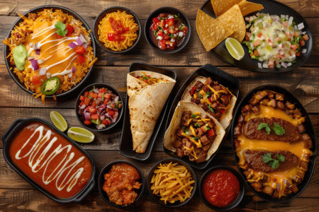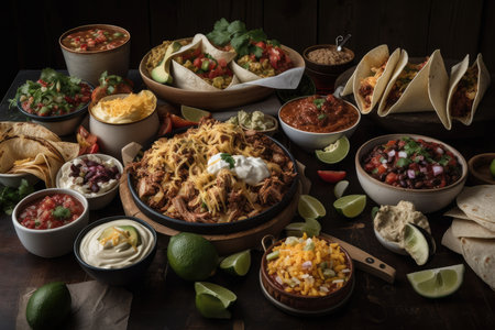 cluster of tacos, burritos, and nachos with various fillings and toppings, created with generative ai
