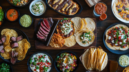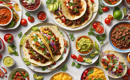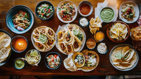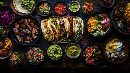A table covered with an array of tacos and traditional Mexican sides, seen from above, ready for a flavorful meal