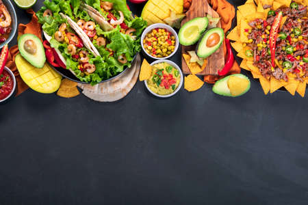 Mexican food side border, above view on a dark wood background. Tacos, burritos, quesadilla and nachos. Copy space.