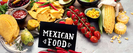 Mexican dishes and snacks assortment on light gray background. Cuisines of the world concept. panorama