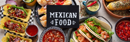 Mexican traditional dishes Tacos with shrimps, meat soup, corn tortillas, tomato salsa on a white background. Top view. Panorama, banner.