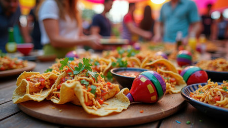 Festive outdoor taco party with colorful maracas and vibrant atmosphere. That the image is generated using AI.
