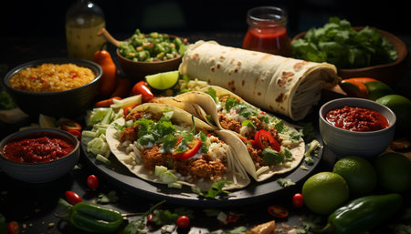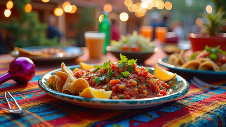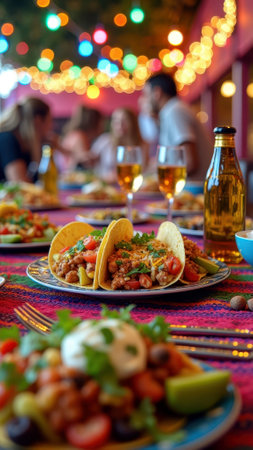 Vibrant mexican fiesta table with tacos, salsa, and fresh vegetables under festive lights. That the image is generated using AI.