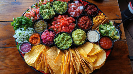 A vibrant taco platter featuring a variety of guacamole, salsa, and fresh toppings, perfect for social gatherings and celebrations filled with flavors.