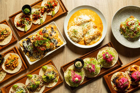 Mexican cuisines. Nachos, salsa, guacamole, burritos, quesadilla, tacos, chili con carne