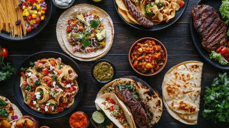 Top view of a table scene with various delicious foods like pastas, flatbreads, tacos, and steak on a dark wood background, perfect for a restaurant theme.
