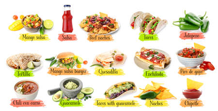Group of assorted mexican food dishes including enchiladas, tacos, burritos, enchiladas, fajitas, chili con carne, muesli and nachos