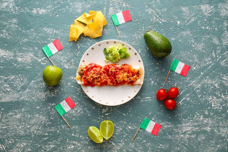Composition with delicious Fajita, vegetables and sombrero hat on dark background