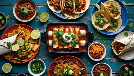 A vibrant flat lay of various Mexican dishes including tacos, enchiladas, rice, guacamole, and tortilla chips, spread across a wooden table. A true fiesta