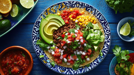 A vibrant taco plate featuring fresh ingredients like avocado, tomato, corn, and garnished with salsa, perfect for showcasing culinary creativity and healthy eating.