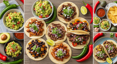 Mexican food collage. Traditional mexican tacos with beef, guacamole, salsa and nachos