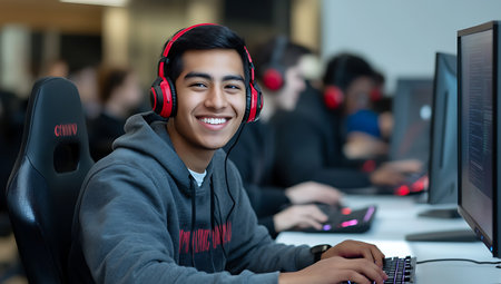 Esports gamer focused on betting interface, immersed in gameplay at a competitive gaming event surrounded by vibrant atmosphere and other players