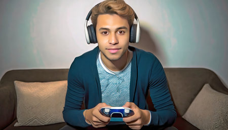 Latino man sitting on the couch, winning his game on the console. He has headphones and controller.Technology concept
