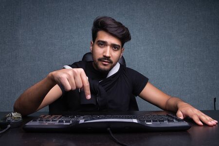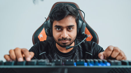 Focused South Asian male gamer engaged in an intense gaming session with a headset and keyboard.