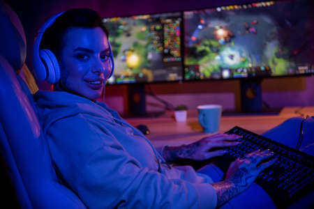 Beautiful young woman with headphones smiling and sitting in front of a gaming PC with neon led lights in her bedroom