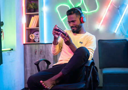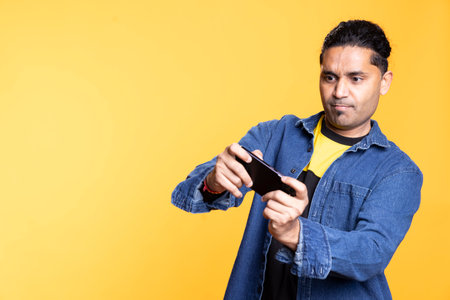 Relaxed Indian guy being entertained by video games on mobile phone, enjoying leisure time in studio. Young player having fun playing games and defeating enemies, man bun expression.