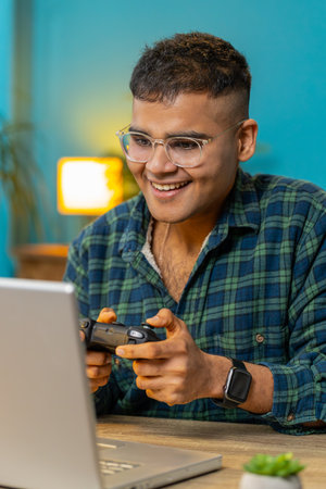 Excited Indian Hindu man playing video game on laptop spending leisure time at home office desk. Happy Hispanic freelancer guy playing video games with joystick controller on computer. Vertical