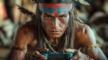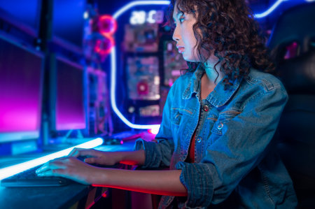 The picture of the gamer that playing the video game inside the room that fill with the neon light, the video game gamer require skills like patience, reflexes, adaptability and concentration. AIG43.