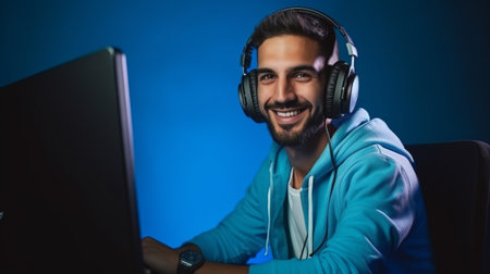 portrait of happy gamer play game on blue background, copy space, professional gamer