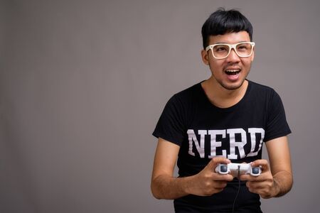 Joyful young man playing video games isolated on grey background. Excited man holding a joystick console looking attentive try to win, having fun in the virtual world.
