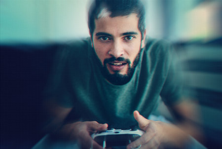 Entertainment, home electronics, gaming concept: a teenager boy playing computer video game with wireless controller gamepad late at night