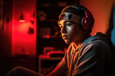 Male Hispanic teenager listening to music headphones bedroom. Generative AI AIG23.