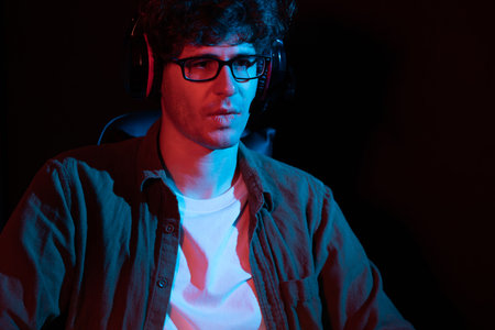 Professional gamer playing online games tournaments pc computer with headphones, Blurred red and blue background